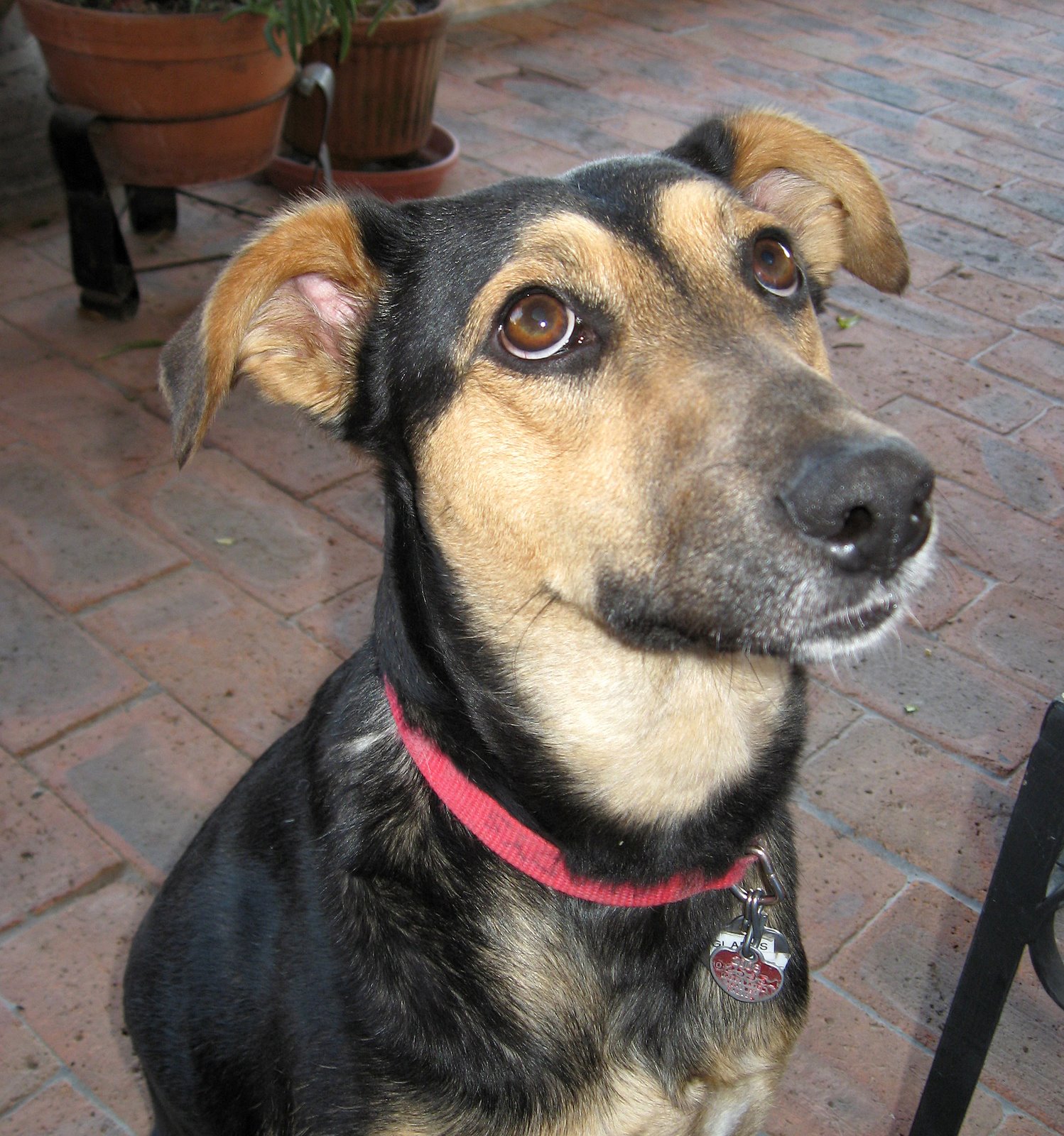 The vet who did the spaying said that judging by the extent of her injuries, Gladys either had been hit by a car or mistreated by her previous owners. Indeed her rear legs are not quite in line, and the tail is permanently crooked and pointing down. Even at her most delirious, Gladys can only wag her tail a couple of inches each way; she frequently pees on herself when she squats, unable to get that gimpy appendage out of the way. Though she can keep up with Lucy and her running sprees, Gladys sometimes limps for no apparent reason.