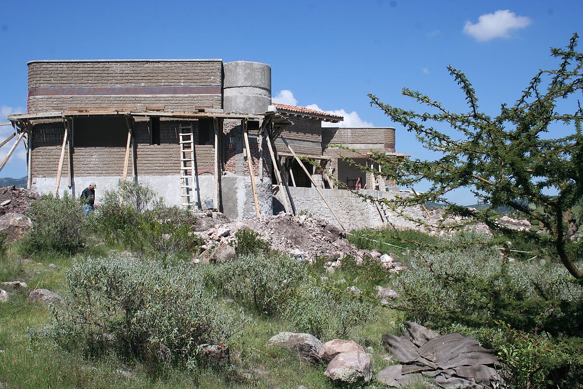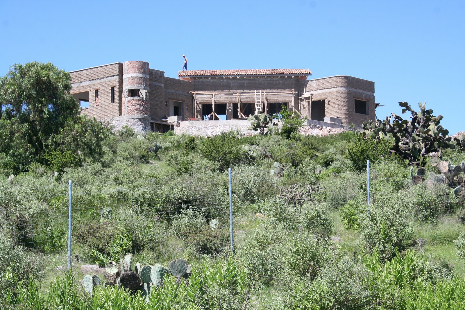 1. This is the front of the house, as you’d drive up to it. The round wall in front, approximately 6′ high, will create a warmer micro-climate garden that will allow, I hope, growing tropical or subtropical plants, as a break from the desert landscape that covers the rest of the land. (There’s an entrance gate by the garage door; that’s another picture.) The antique roof tiles, reportedly from Oaxaca, are also a recent addition. They each weight about 10 pounds are just rest on the roof without any cement or other adhesives.