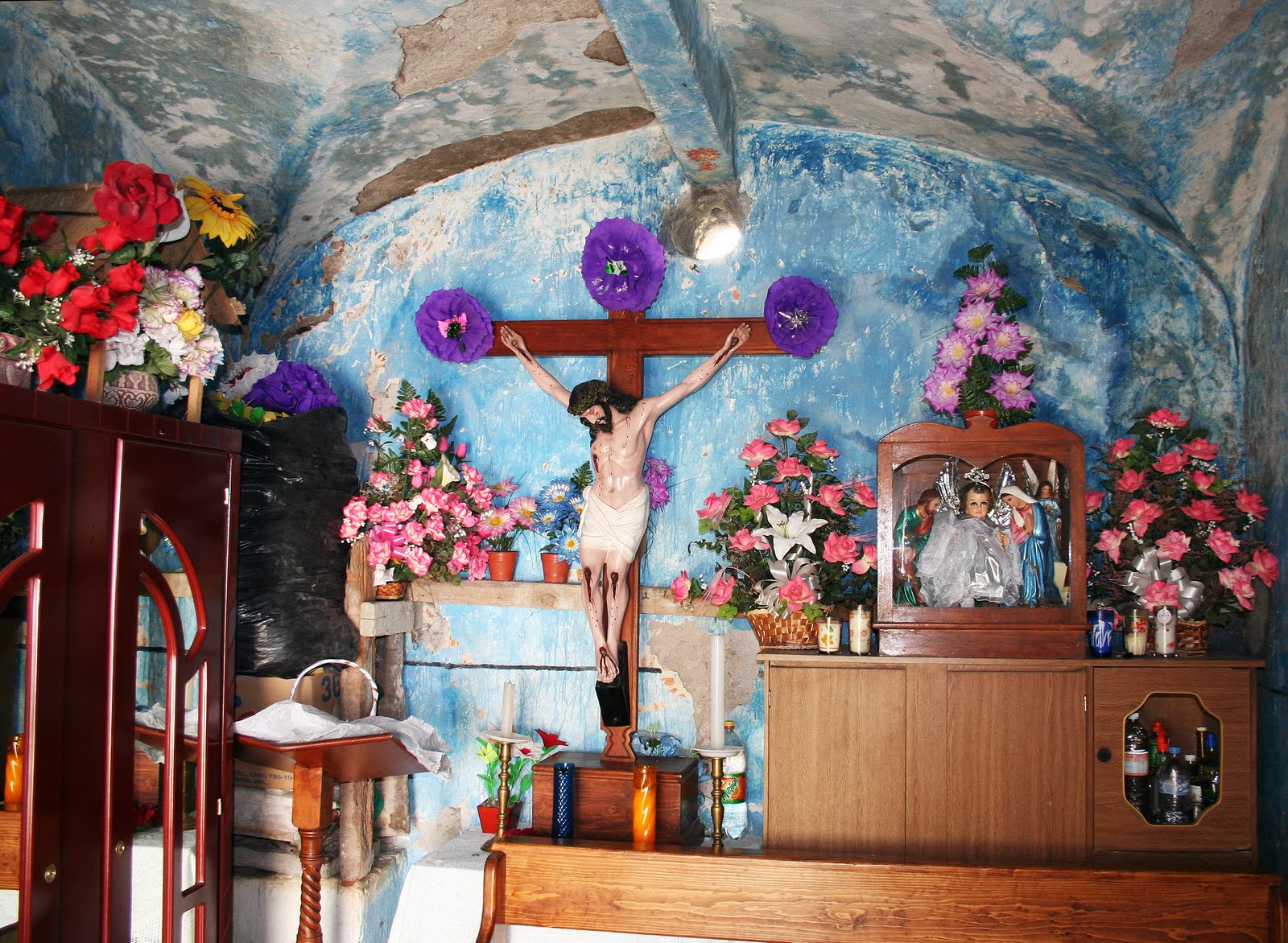 Now Felisa wants to restore the sacristy, a room the size of a walk-in closet off to one side of the altar. Its walls are pockmarked by missing chunks of plaster. Ventilation is a hole through a wall. Religious artifacts, including a crucified Jesus with strangely large breasts, are mixed up haphazardly with plastic flowers and dusty candles. It looks like a religious garage sale.