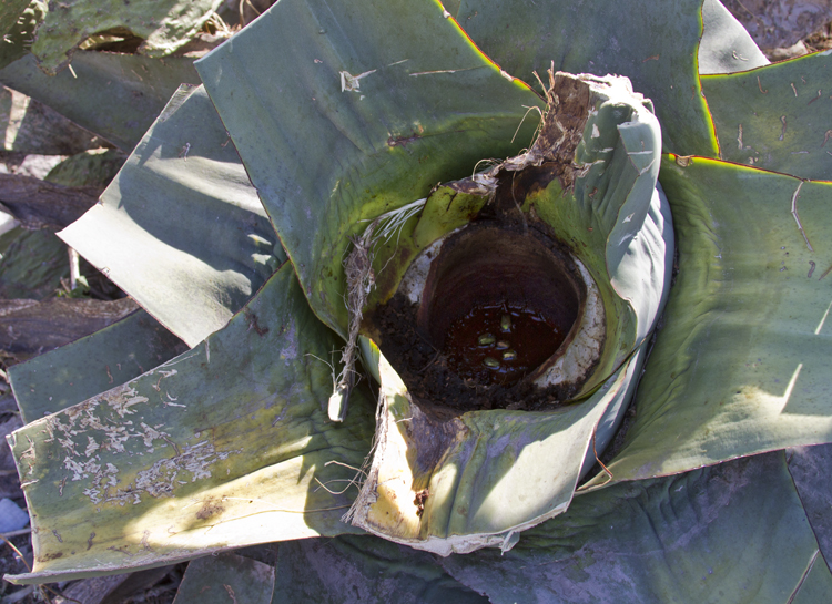 | A dark pool of aguamiel at the core of an agave. |