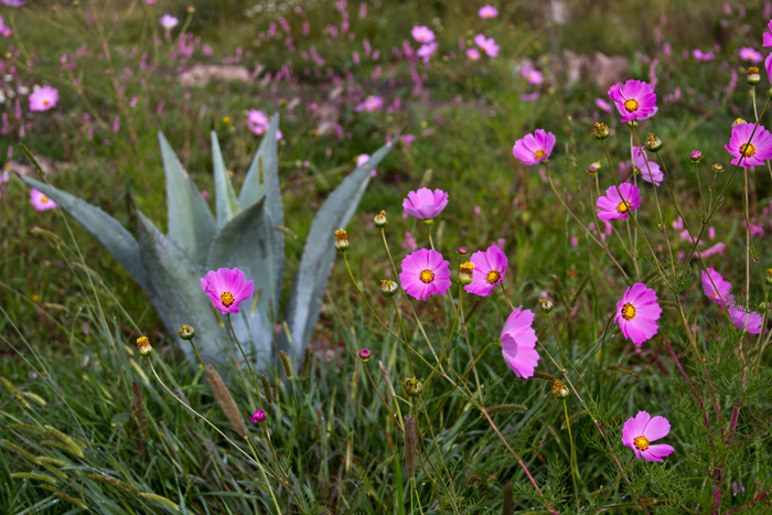Before we had fenced in our land, sheep and other livestock had munched practically everything down to a stubble. But over the past two years wildflowers have returned as if they had never left, particularly the cosmos. The seeds from spent flowers blow off in all directions, to bloom next year in a geometric progression of color.
