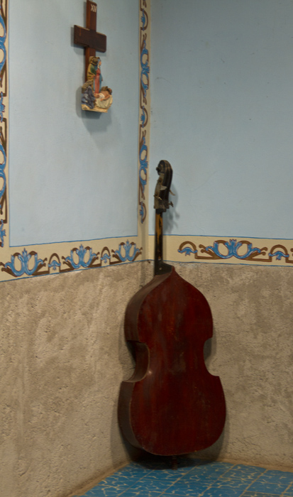 The big church was very much a live operation, decked out with natural and artificial flowers, holy statues and even a base fiddle leaning gently on one corner, ready to turn around and join the next religious shindig at a moment’s notice.