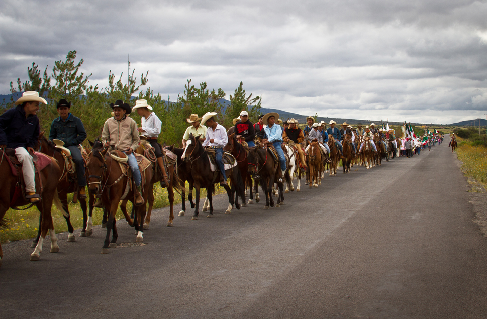 As the procession stepped off at 8:30 a.m.–punctually, a surprising touch for any kind of Mexican event–the first thing I noticed was the pace. I figured that a group of devout old matrons, teenagers and assorted kids would likely amble, meander or cruise leisurely through the countryside. This was more like an aerobic trot that had me struggling to keep up while trying to shoot photos. Riders joined the pedestrians at the same pace or faster; I don’t know who was trying to keep up with whom.