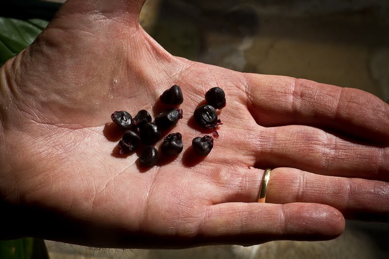 One of them is some sort of purple corn, almost black, that we found at a display in a restaurant in Cusco. I asked for an ear, put it in my pocket and then packed it deep inside the luggage, far from the sniffing mutts employed by Mexican customs inspectors. The ear of corn made it through and sat on the kitchen window sill for months. Then on another lark, like eating guinea pigs, we planted some of the kernels, which look like raisins.