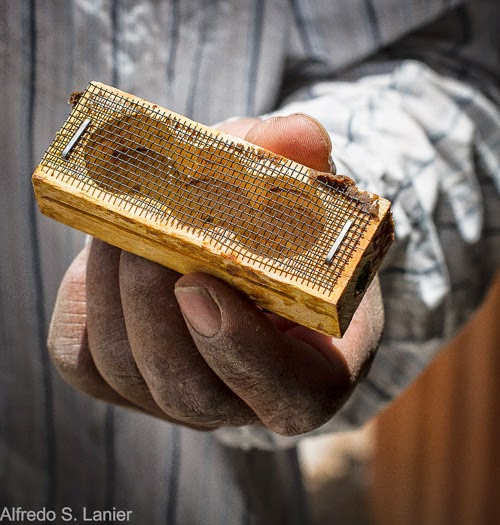 Her death, however, quickly turned into a rebirth for the hive as a new queen arrived from Morelia, the capital of the neighboring state of Michoacán, neatly packaged for the trip in a wooden container the size of an old-fashioned matchbox, big enough to accommodate the queen and three or four other “attendant bees”. The queens are marked with a tiny dot of paint, the color of which indicates the year they were bred. Green is the color for 2014 though these dots are difficult to see unless you’re an expert.
