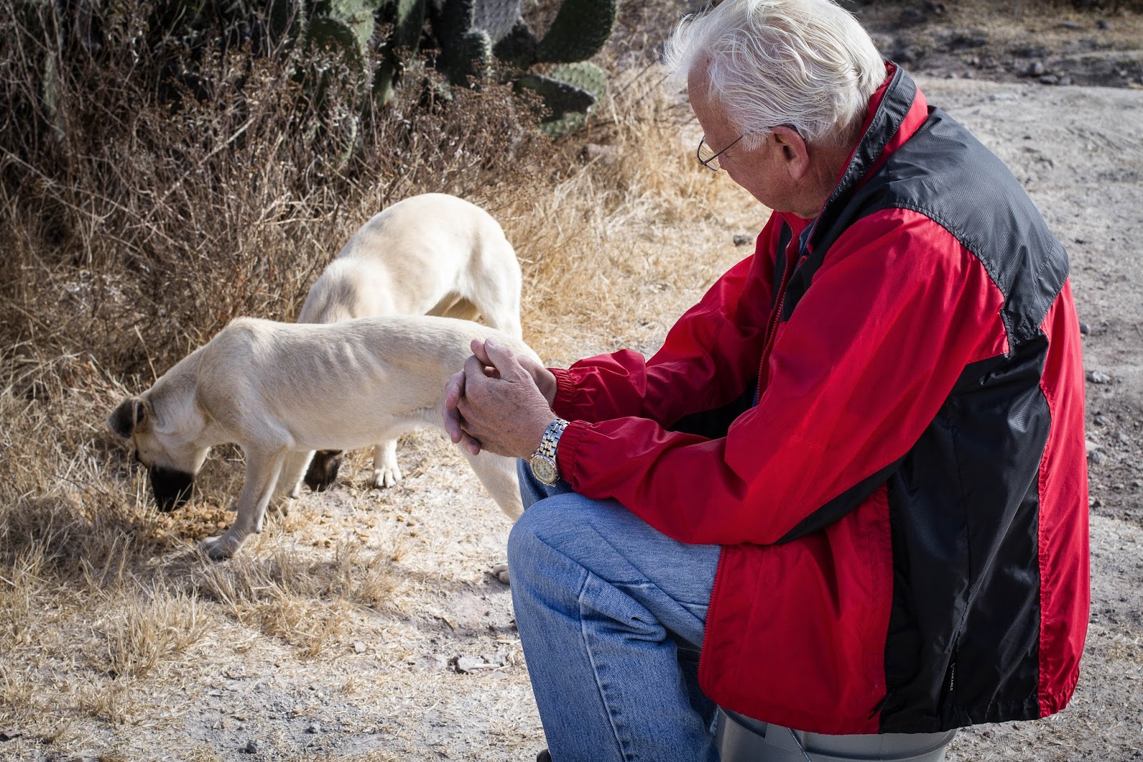 Those who show up mob Stew, who lugs a bucket of dry dog food, as if were a savior which indeed he is, because without his handouts many of these dogs would starve or get run over on the busy nearby road. Just as important as food, Stew doles out affectionate pats on their heads and a bit of conversation that is much appreciated though neither side understands a word.