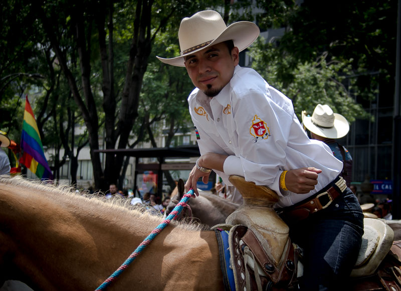 Leading the parade was a tangled, four-hundred-meter-long rainbow flag—about thirteen-hundred feet—that took forty-five minutes or so to unfurl, followed by a huge balloon in the shape of a condom. A little farther behind was a posse of vaqueros wearing the intricate, formal regalia Mexican cowboys, and who rode horses that seemed increasingly impatient with the going around in circles waiting for the crowd to move.