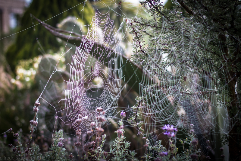 Just in time for Halloween, and the Mexican celebration of the Day of the Dead, spiderwebs have appeared all over the ranch. Some are small, maybe six inches across, others can span gracefully and grandly for three or four feet, sometimes from one bush or tree to another. A few are works in progress, just a lone strand between two bushes, as delicate and perilous as the wire that carried aerialist Philippe Petit between the two towers of the World Trade Center.