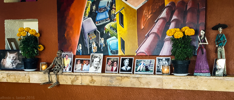 So this year Stew and I have put together our own Day of the Dead altar over the mantle of the fireplace, with the requisite orange marigolds, votive candles and photos of our dead relatives whom we will remember: Both of our parents (Mario and Georgina, and Thorleif and Frances); our grandmothers, mine maternal (Herminia), Stew’s paternal (Verda); my paternal uncle Alejo and my cousin Gustavo, a lovely, dog-loving human being who succumbed to mental illness and committed suicide while still in his forties. Naturally we’ve also included some of our pets that have gone on to claim their eternal reward of kibbles.