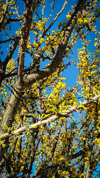 “Not so!” I heard some bees yell back at Stew, as they merrily attacked a few trees and bushes already flowering. The yellow blossoms that nearly cover the jarrilla bushes almost vibrate from the commotion of the frantic bees. Some small butterflies are also reconnoitering for flowers.
