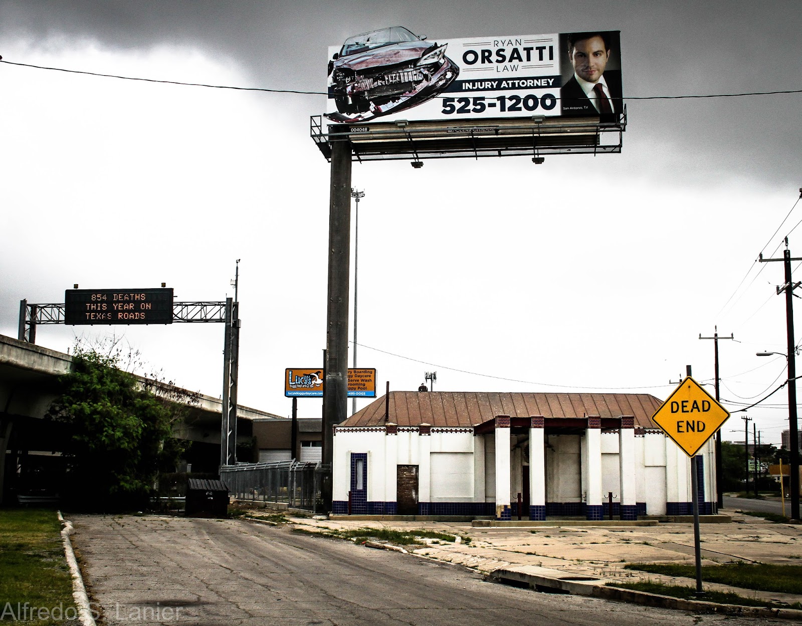 billboard above and a noisy dog kennel behind. Across the street