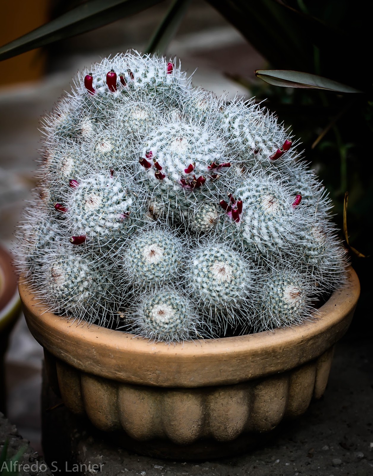 | This cactus, about the size of a baseball, looks like a miniature barrel cactus. It’s about to set flowers, probably bright purple, that will cover its head. |