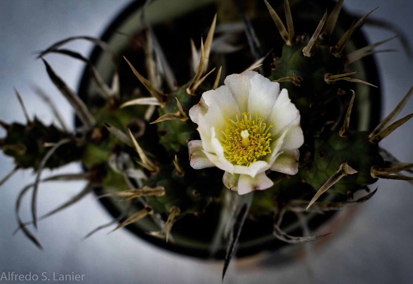 Yesterday afternoon a potted cactus sitting by the dining room door sent off an amazing white flower, that this morning awakened modestly folded up.