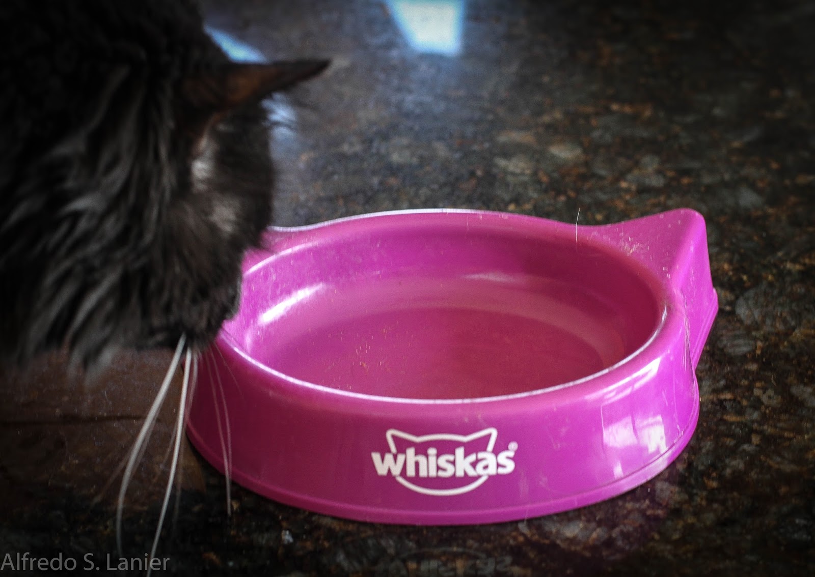 | Potential health problem: Notice Paco’s whiskers rubbing against the food bowl. |
