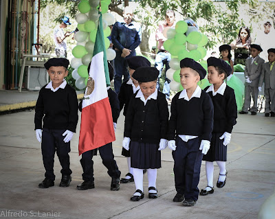 The ceremony began with an honor guard that escorted the flag around the covered school yard, and then led everyone in the singing of the Mexican national anthem, a rousing piece of music a little reminiscent of Le Marseillaise.