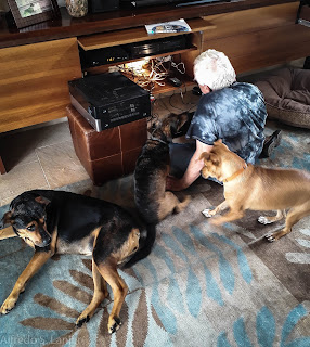 | Stew and three of our highly-trained dogs looking under the stereo cabinet to assess the nature of the problem. |