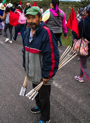 Some were on horseback and carried banners identifying their hometowns, and carried additional shrines covered with flowers. A older and disheveled fellow, who looked as if he had started the celebration the day before, clutched a handful of fireworks and walked along setting them off periodically to announce the approaching procession.