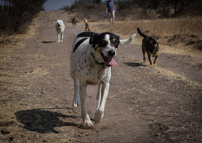 Now that off-the-leash runs are part of the daily routine, the dogs will demand for us to get going,  barking by the kitchen door right after we finish breakfast. Out the main gate they stampede in a dust storm, like a small herd of cattle, barking and chasing anything on the way, and going in all directions until one of us calls the pack to order. They then continue right or left, wherever we lead. Malcolm, an orange dog who lives outside the gate joins our the walk, as an unofficial member of the gang.