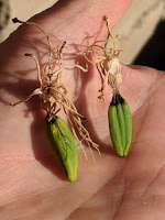 Then this week, the flower show was over and they were replaced by substantial elongated seed pods that dangled from the branches like ornaments on a Christmas tree. The wind loosened the seedpods and carried them all over, including our terrace, where we found several dozen scattered on the flagstone. Some undoubtedly blew over the ground several feet in every direction, and a lucky few will germinate and produce the next crop of tequila agaves.