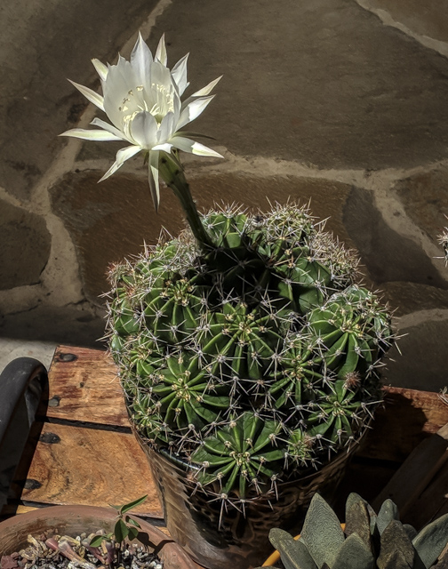 Recently an untouchable round, barrel-like cactus with a thousand thorns—I gave up trying to figure out these customers’ botanical or common names—sprouted a single, beautiful white flower. I stopped to admire it and photograph its awesomeness. The flower dropped off in a couple of days.