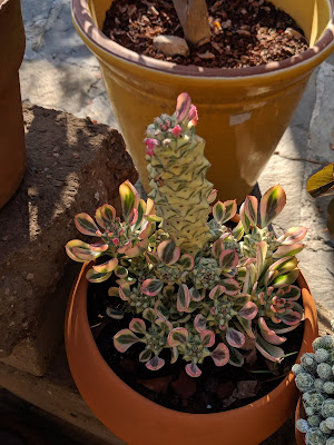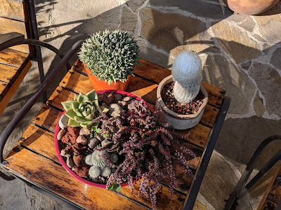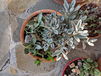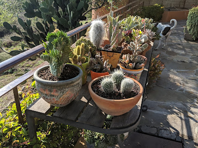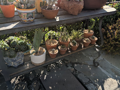 Not all succulents bask in the sun. Some begin showing signs of sunburn if left in the broiling mid-afternoon sun. Félix and I now recognize the early symptoms and move them from the back terrace to the front, under an awning with a plastic sunscreen over it. On the back terrace it can seem like musical chairs as we move pots around.