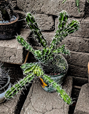 My utilitarian take on succulents quickly gave way to fascination. They can be exotic and contorted, or if you will, downright weird, like nothing found anywhere else in nature. Some have graceful stems crowned with leaves, other are just round stumps. Many are covered with thorns to remind people and animals to stay away, while others have velvety leaves, ready for caressing with the tips of your fingers.