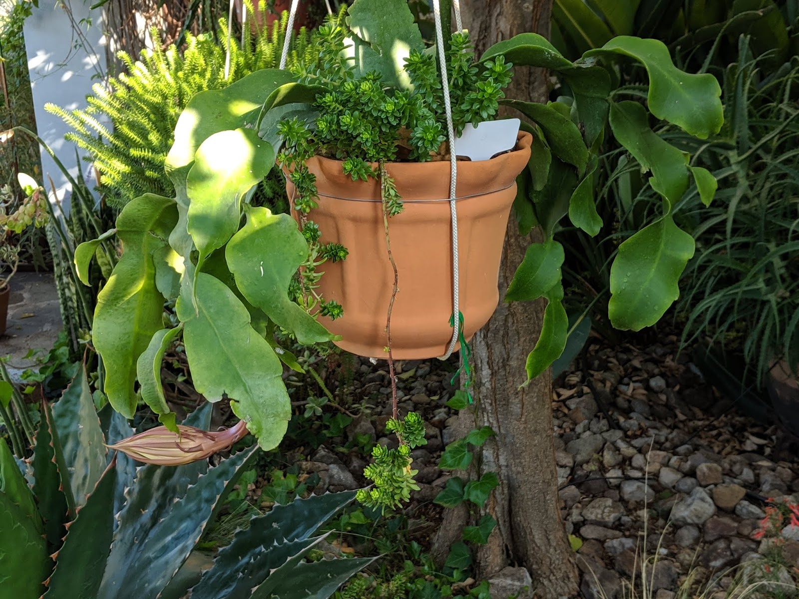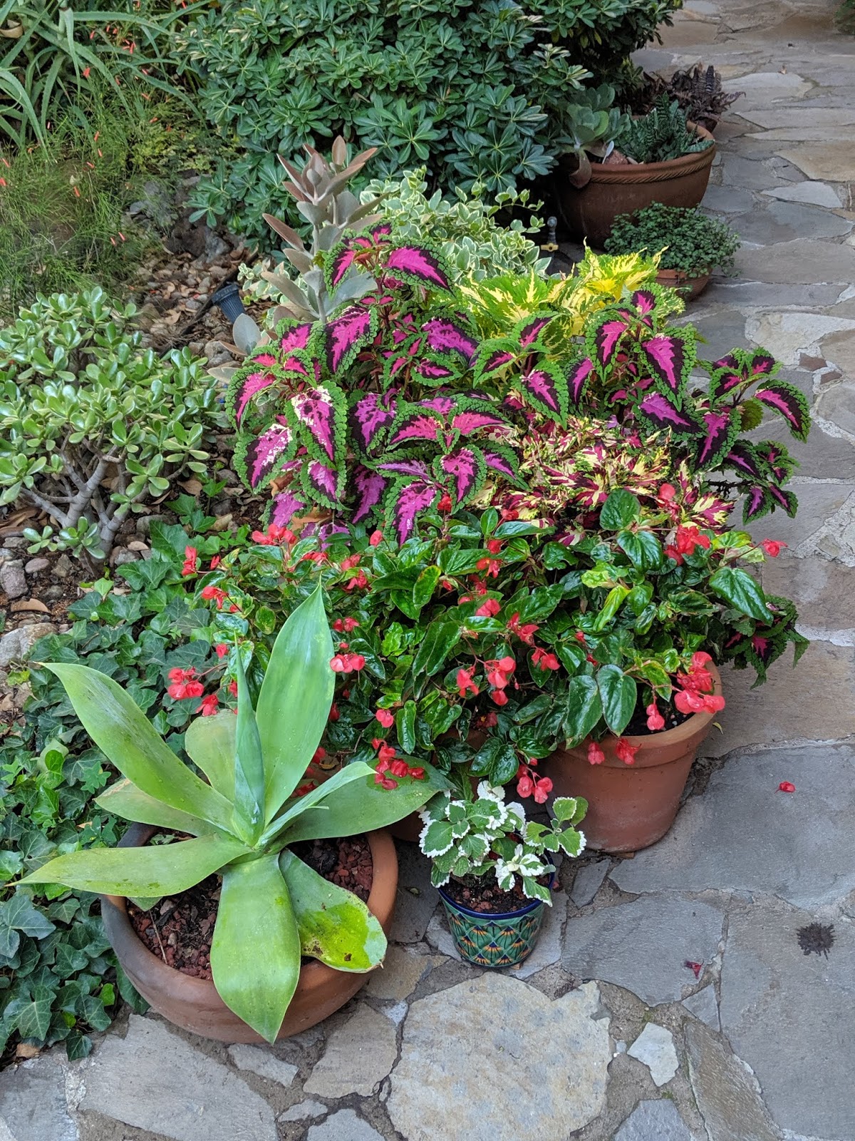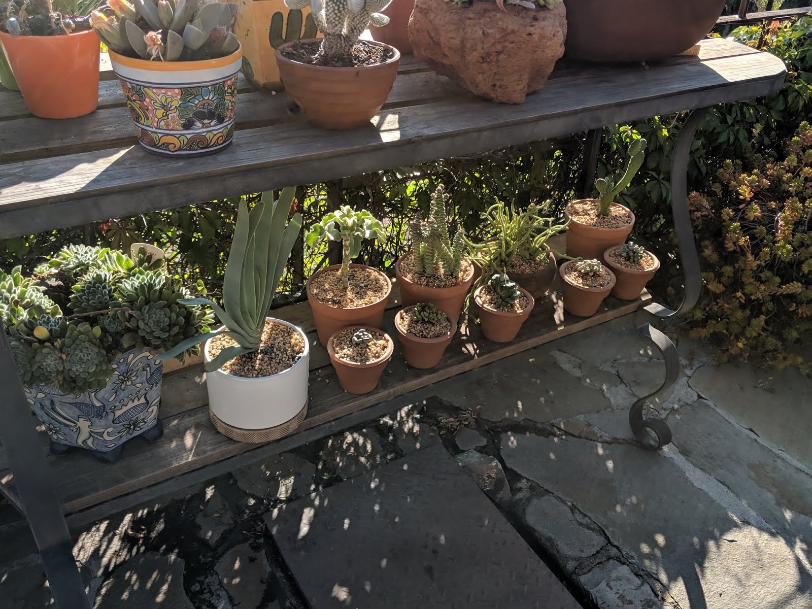 Not all succulents bask in the sun. Some begin showing signs of sunburn if left in the broiling mid-afternoon sun. Félix and I now recognize the early symptoms and move them from the back terrace to the front, under an awning with a plastic sunscreen over it. On the back terrace it can seem like musical chairs as we move pots around.
