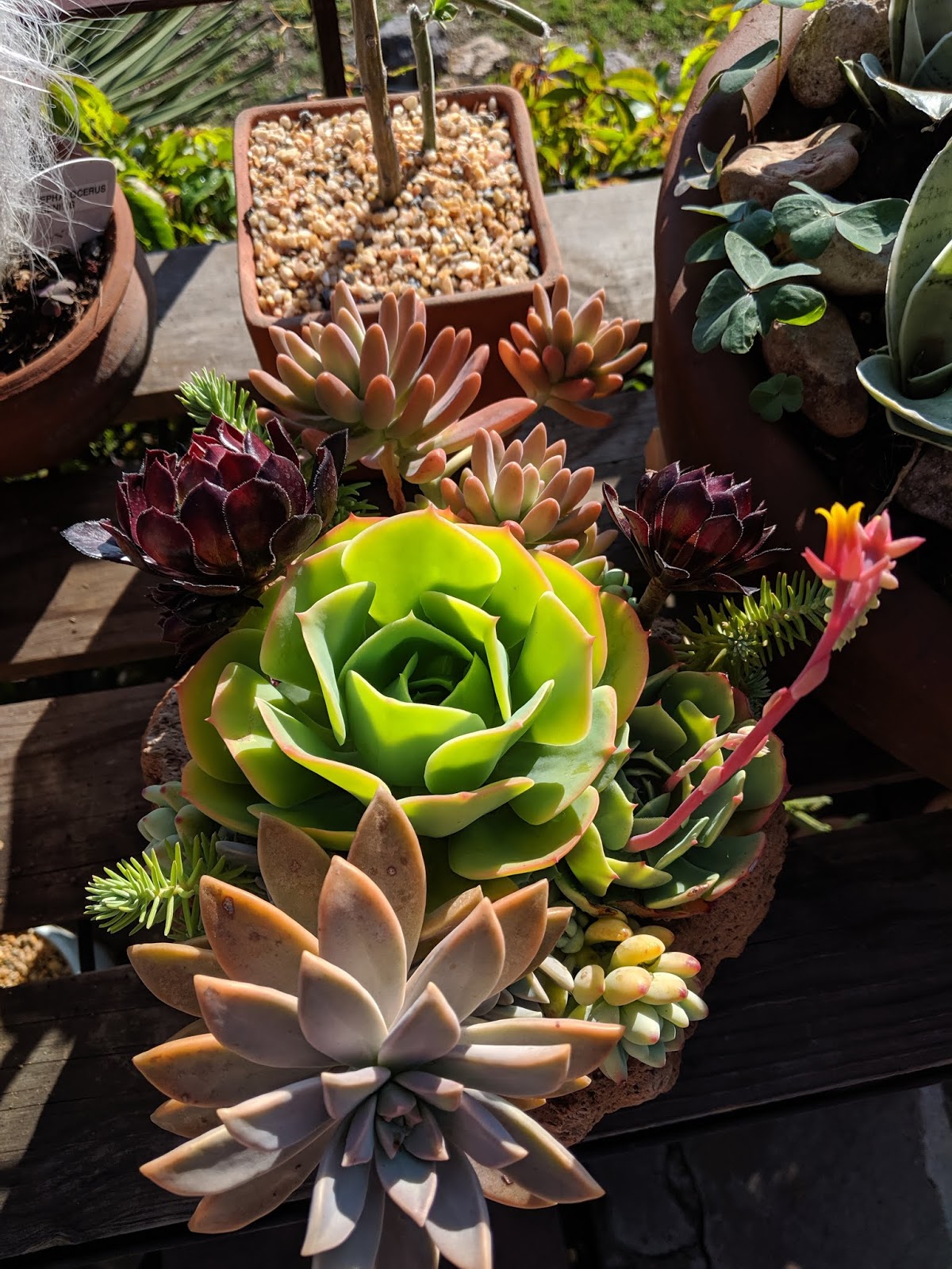 | This mashup contains some succulents along with four pots of coleus. |