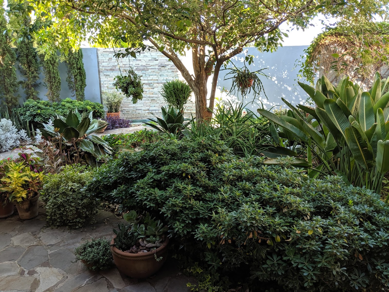 | This patio in the front, protected by walls on all four sides, is a shady micro-climate, accommodating a variety of plants. |