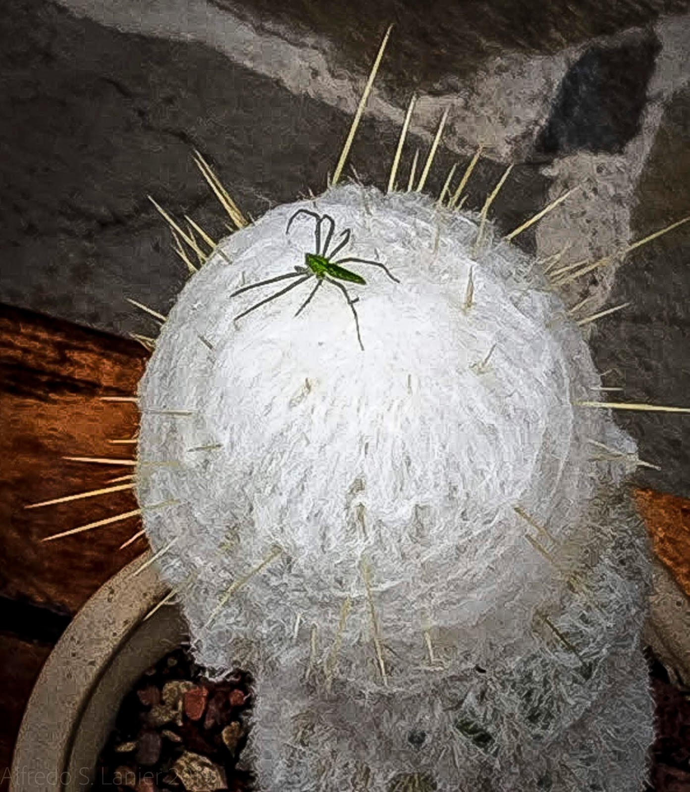 | This one is a variation of the so-called Old Man Cactus, seen here with a green bug navigating carefully, —very carefully—through the thin spines. |