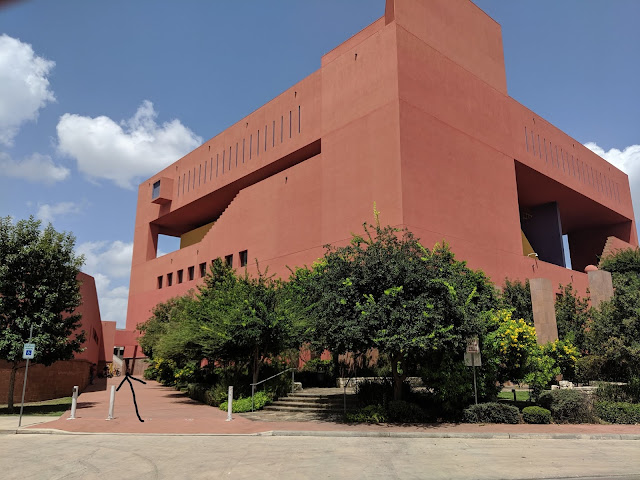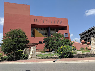 The central library stuck me as a brutalist design, even if its boxy, windowless expanses are not bare cement but a salmon shade of red, favored by modern Mexican architects. Locals call the color “enchilada red.”