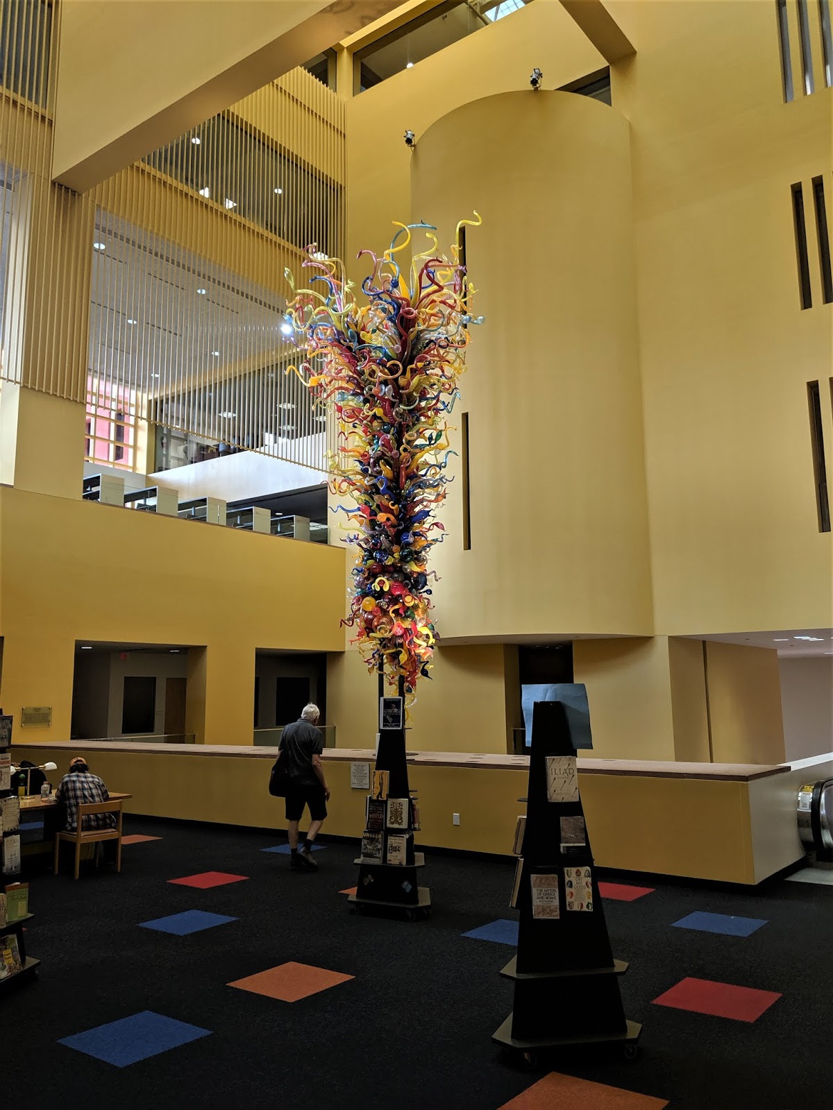 Or perhaps to enjoy the lofty ambiance of some of the grand interior spaces of this building, particularly the main room, with light-orange walls of different shapes and a giant hanging glass sculpture by Dale Chihuly bathed by spotlights, or the private nooks and crannies, even if, alas, some of the nearby shelves are empty.