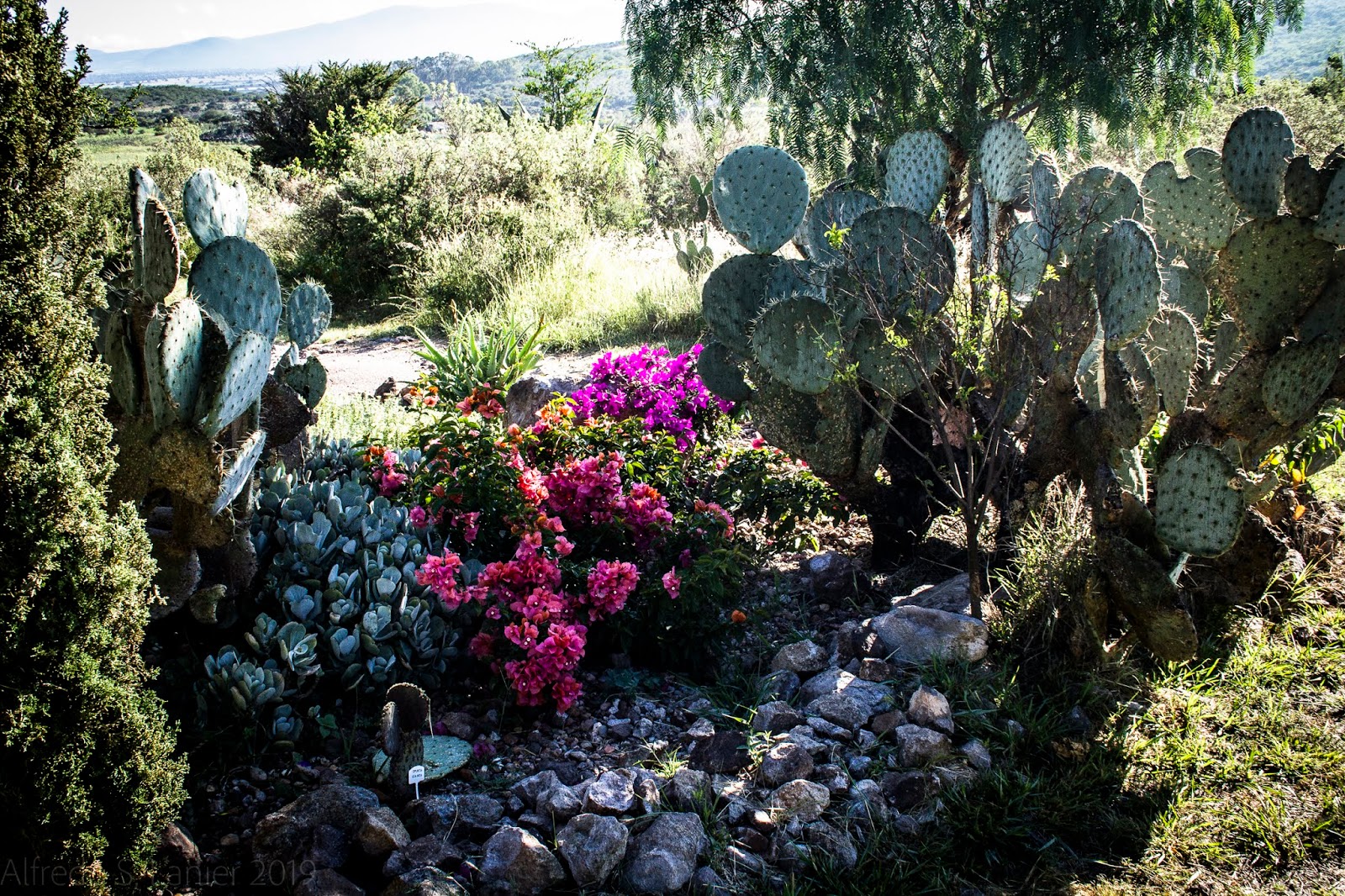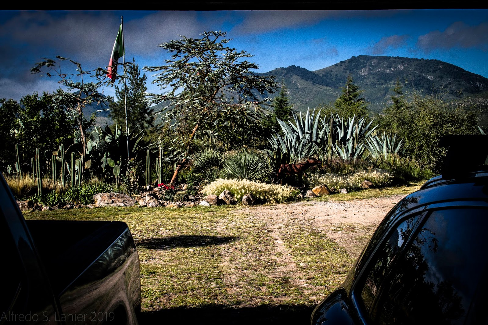 When the garage door slowly clanged open yesterday morning, it gradually revealed a stunning slice of our garden. At this early hour, about eight, the air was bracing, almost cold, and the mountains rising over the horizon still had a hint of the bluish morning fog. On this, the weekend when Mexicans are celebrating the country’s independence, our faded Mexican flag barely fluttered.