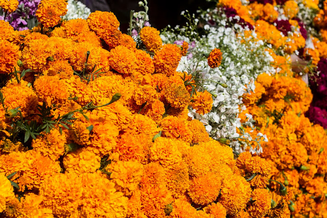| Mountains of marigolds, the traditional flower of the Day of the Dead. |