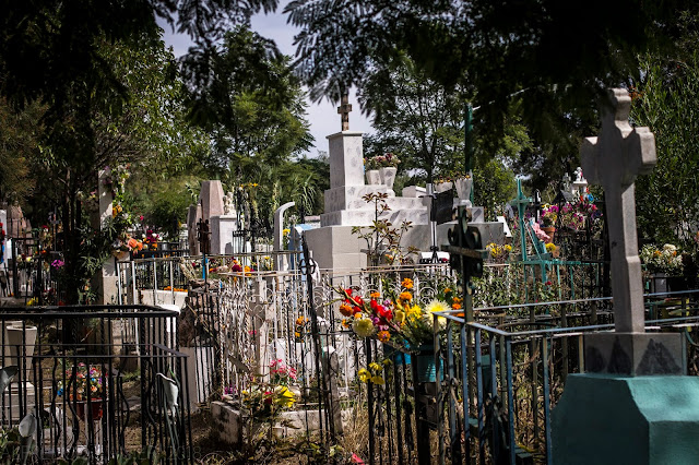 To reach the expat section, one has to traverse almost the entire length of the entire cemetery, which on Day of the Dead is a cacophonous frenzy of activity, with relatives painting and decorating gravesites.