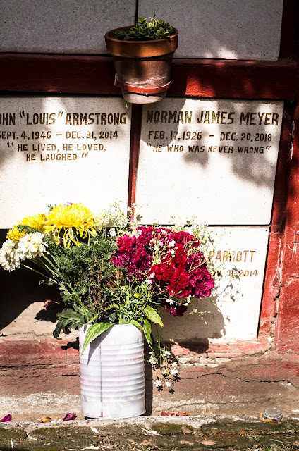 For us it’s a more traditional gesture of remembrance of friends who died the year before. This year we visited Norm Meyer and his son-in-law “Louie” Armstrong, whose ashes rest in simple side-by-side crypts.