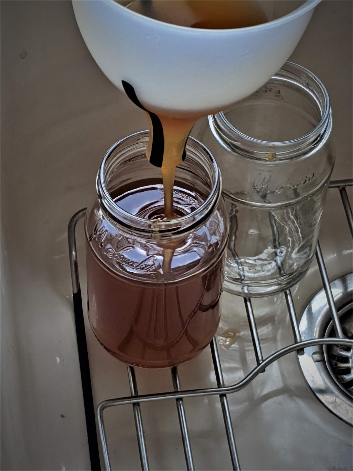 While they were in the garage during this operation, the dogs and I were safely hiding in the kitchen running about 20 glass jelly jars through the dishwasher, that we hoped would be filled with honey, ahead of 30 or 40 more stored in the basement.