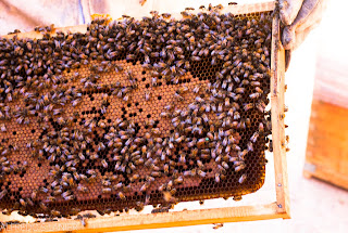 The beekeeper took us to a ramshackle storage yard, filled with discarded hives and other supplies and began pulling the frames full of bees out of a wooden box, examining each one carefully. He pointed out the two queen bees, and carefully put each frame in our two new hives.