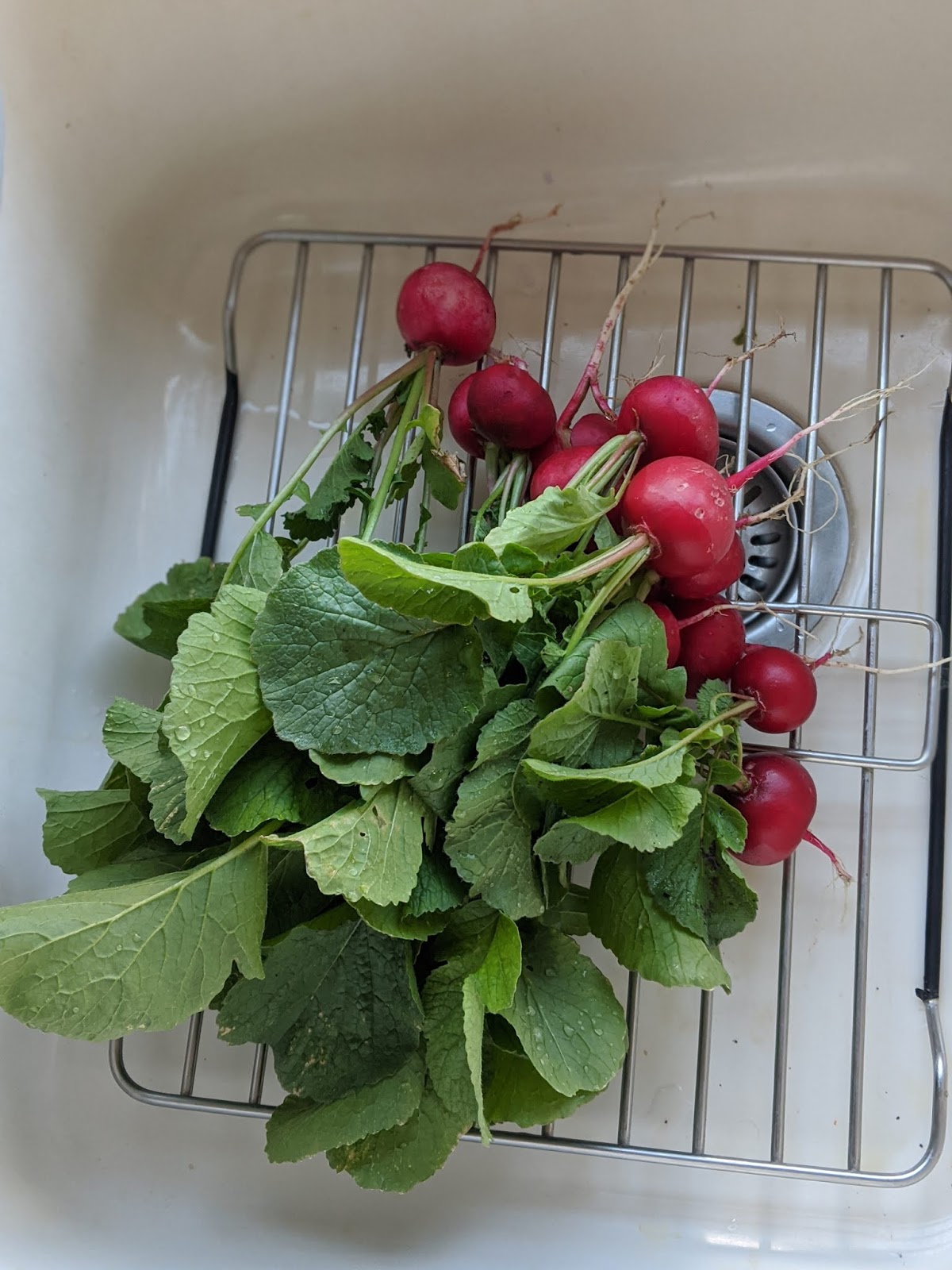Morash even has a recipe for Radish Tops Soup that sounds a little weird, but require more radish greens than we have. The bunch of radishes that arrived yesterday, I’m sure, is but a prelude to a upcoming avalanche of radishes, tomatoes and everything else.