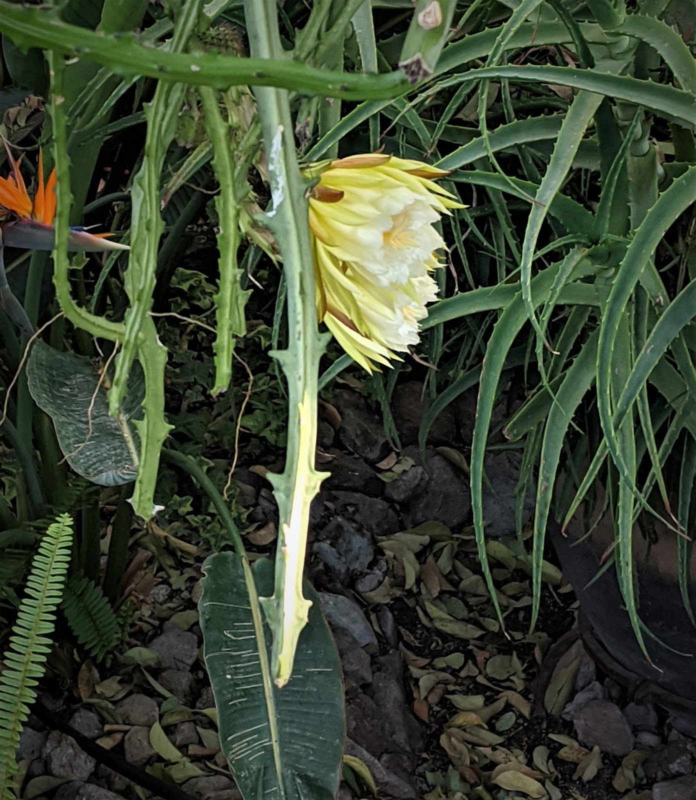 But then, one day, giant, complex, bell-shaped flowers, vaguely resembling those of a hibiscus plant, emerge from the thorny branches.
