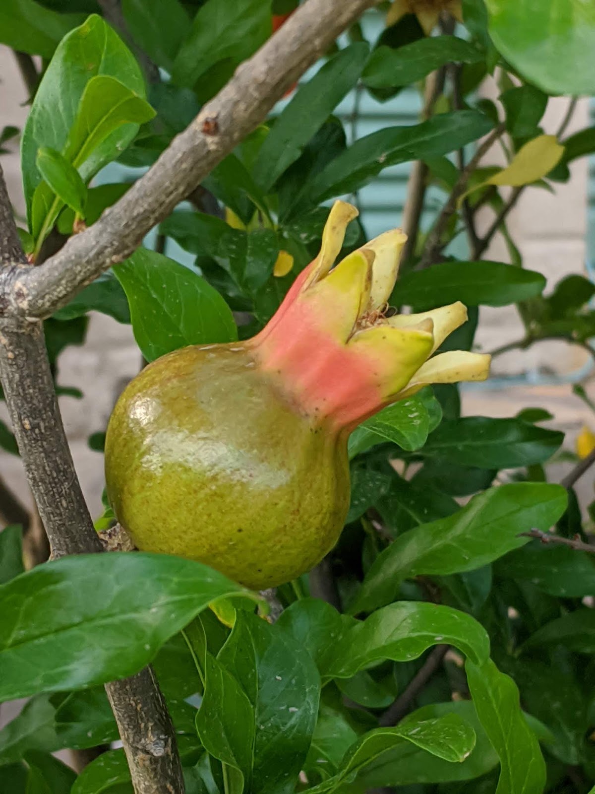 Also coming on line is our volunteer pomegranate bush outside the garage. We have no idea where it came from, and we don’t quite what to do with the avalanche of fruit, except squeeze out the seeds and put them on salads.