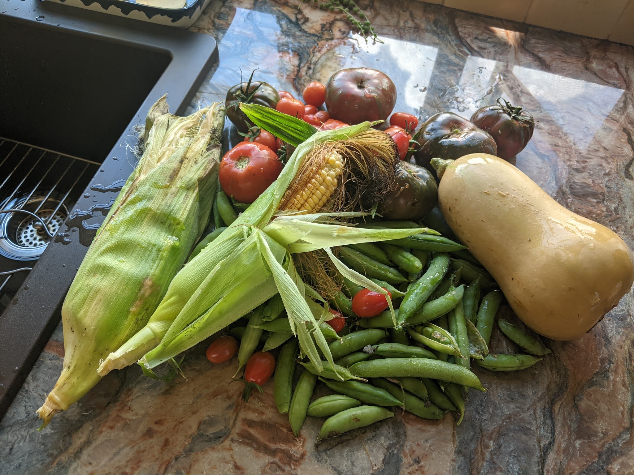I don’t know what went wrong. Maybe I bought the wrong kind of corn from Burpee Seeds (“Golden Bantam Heirloom”). I wrote Burpee a note to inquire. Maybe there was too much rain? More than a few times, the corn fields around us have been swamped by the downpours, though the corn looks better than it has in years. Or perhaps my cooking it on the grill, with the husks on with some butter squirted inside, was not a good idea. Boiling may be better.