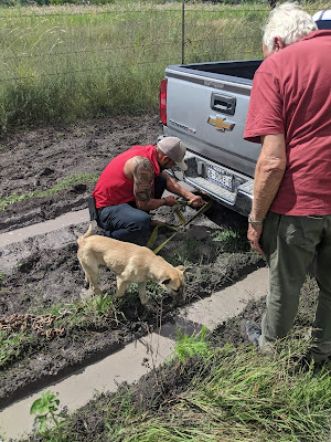 We drove back to the ranch with the truck covered with mud, including the windshield, and carrying 10-pound clumps of gooey mud on each foot.