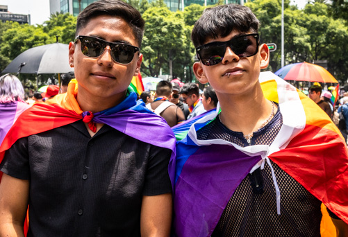 Realistically, though, anything related to Mexico’s Pride parade, including attendance figures and starting times, has to be calculated grosso modo or más o menos. Unlike parades in the U.S. in which marchers neatly gather behind banners announcing certain organizations or political causes, in Mexico thousands of people begin arriving at around nine o’clock long before the official starting time of noon. From there the crowds rapidly grow in numbers and noise, like a hurricane of joyous people gathering strength.