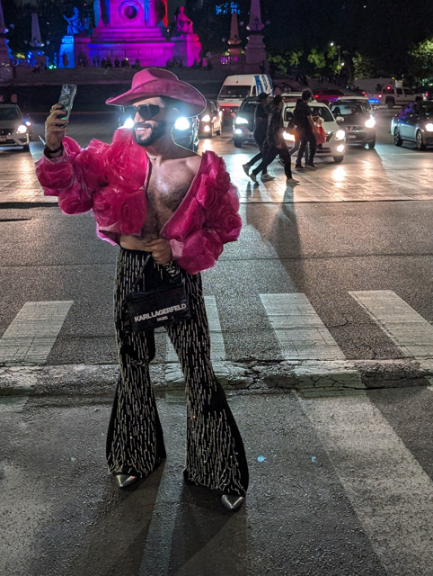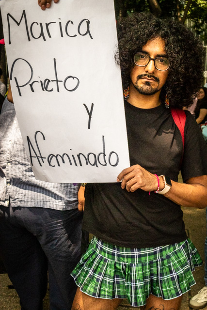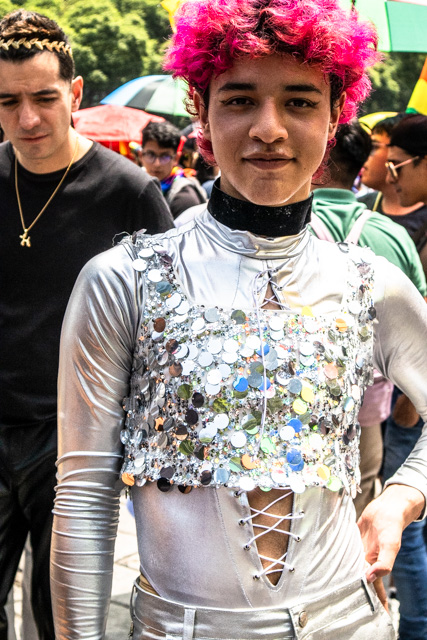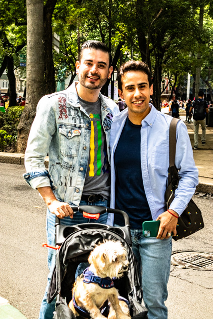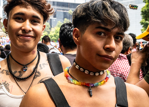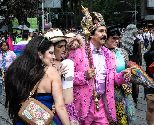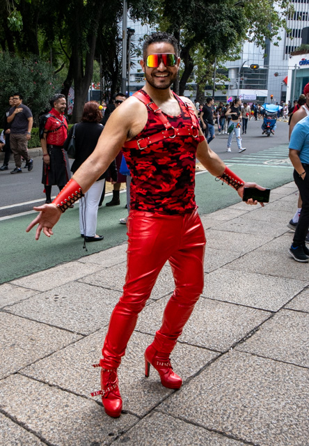 Compared with some American cities, such as Chicago, which deployed extra police forces during the Pride celebrations this year, in Mexico City visible police presence was minimal except at the end when phalanxes of traffic cops on motorcycles, sirens blaring, shooed people back onto the sidewalks to clear the streets. Even potentially combustible situations such as a knot of pro-Palestinian protestors at the foot of the Angel, went on peacefully.