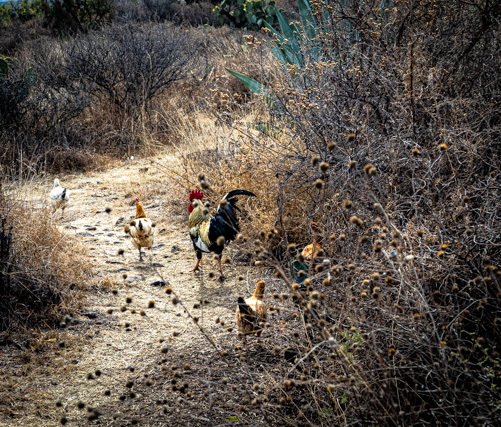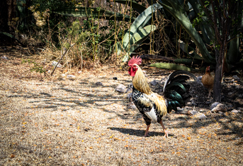 I’ve refrained from naming the hens, which are pretty much undistinguishable from one another, and risking them becoming pets. But the rooster, a large and regal, colorfully plumed specimen, I’ve named Fernando. Several times a day he jumps on a rock and crows several times to let the hens—and us—know he’s king of this small jungle.